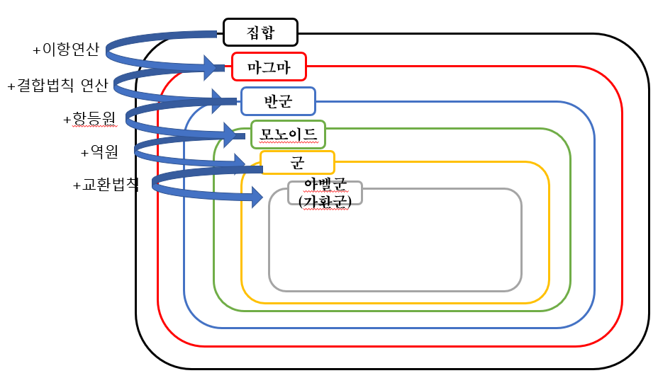 용어를 집합으로 나타내면 대충 다음 그림과 같다. 아벨군은 결국 우리가 손쉽게 하는 사칙연산 풀패키지 같은 느낌이다.