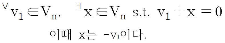 v) 덧셈의 역원이 존재. 사실 항등원이 존재한다면 자연스래 역원은 따라온다.