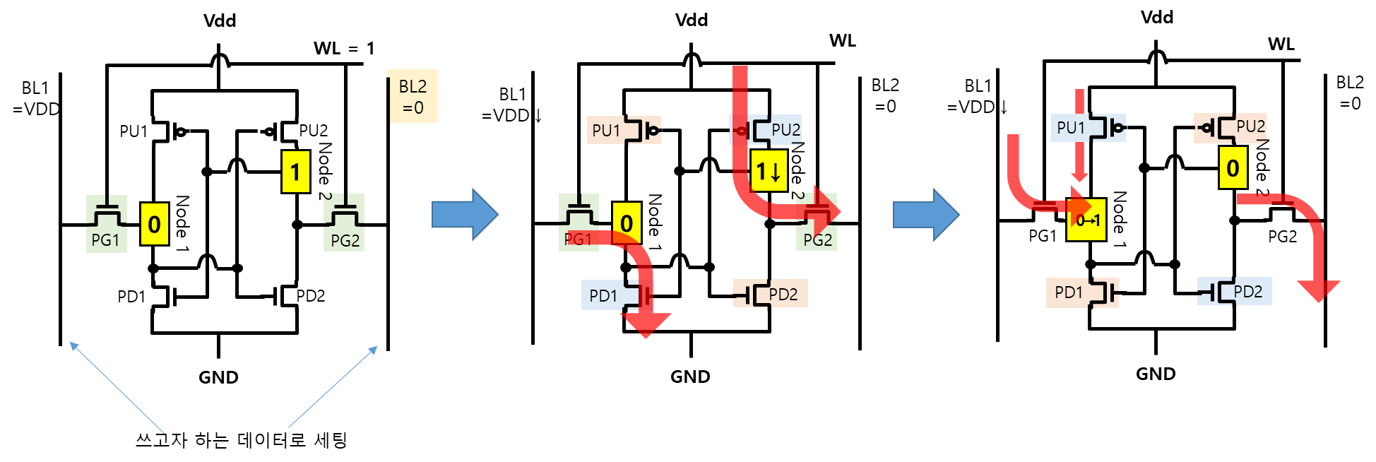 - Node2 전압이 낮아지면, PU1이 On되고 Node1 전압이 올라간다. 이에 따라 PU2도 Off되며 Node2 데이터도 0으로 감소한다.
