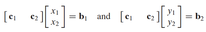 이때, x1, x2는 [c1 c2 : b1] 첨가행렬을 row reducing 해서 [I : [b1]c] 꼴로 나타내고, y1 y2도 마찬가지로 row reducing 해서 찾아야 한다.
