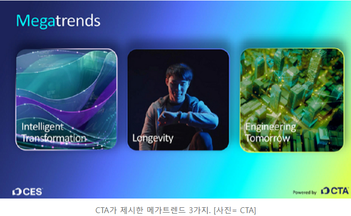 지능형 전환, 장수, 미래 기술의 3대 트렌드 제시 CES를 주최하는 CTA는 매해 개막 전 행사로 '올해 주목해야 할 기술 동향'을 발표한다. 올해에는 지능형 전환, 장수, 미래 기술의 3가지 메가 트렌