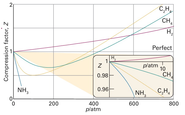 반대로 적당한 압력 이하에선 Z가 1보다 작은값이고, 이때는 인력이 더 우세하다는 것을 알 수 있다.