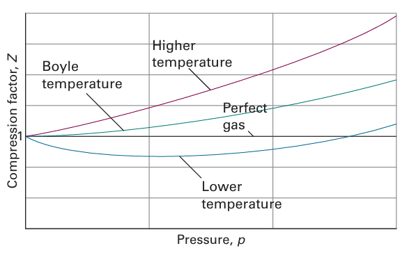 그리고 같은 기체라도 온도에 따라서 Z값이 달라지는데, 이리 저리 조절하다가 p->0으로 가는 극한값의 기울기가 딱 0인 온도가 있다. 이 온도를 보일온도(Boyle temperature)라고 하며, 실제기체 성지로가 이상기체 성질이 일치하게 된다.