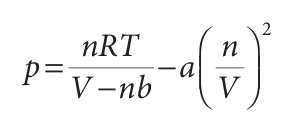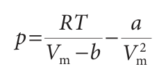 따라서 분자 입자들이 차지하는 부피를 빼고, 또 분자간 인력으로 압력이 감소하는 영향을 받는 것을 보정해주는 일련의 과정을 거치면 다음과 같은 식이 만들어진다.