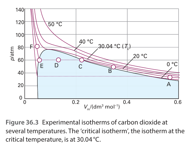 위 그래프는 이산화탄소의 등온선 마다 압력을 다르게 하며 상변이를 측정하는 실험이다. 파란색 부분이 상변이가 일어났다고 보면 된다.