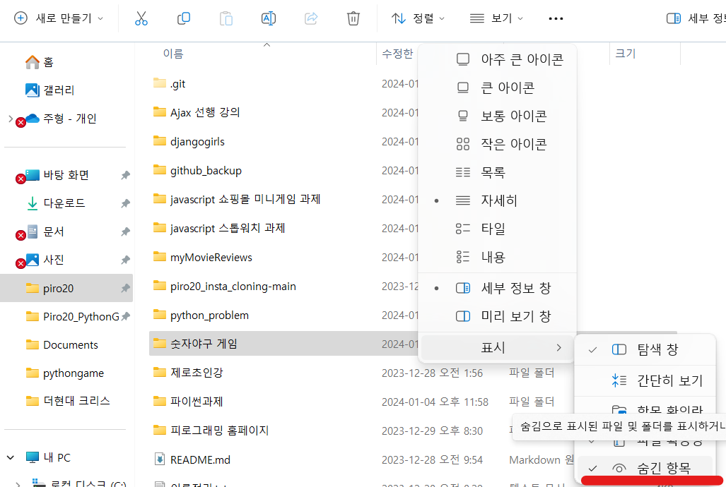 보기 > 표시 > 숨김항목표시 한 후 .git파일을 삭제해줬다