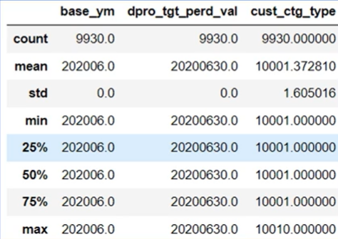 | df.columns | 컬럼명 확인, 리스트 형태로 반환 | Index('base_ym','dpro_tgt_per_val','cust_ctg_type'] dtype='object') |
