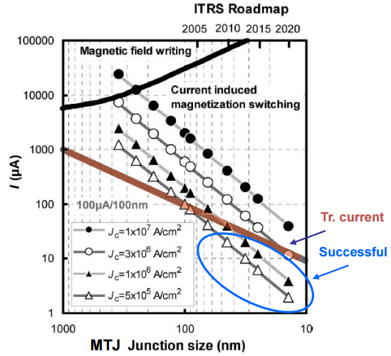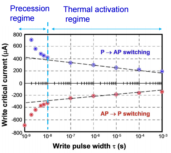 Write time 감소할 수록 MTJ swiching에 필요한 전류는 증가하는 추세를 보이는데, 10ns 이상에서는 열에너지의 도움으로 switching 전류 감소하고 10ns 이하에서는 열에너지의 기여가 어려워서 switching 전류는 급격히 증가하고, 결국 write시간을10ns 이하로 하는것은 어렵다.