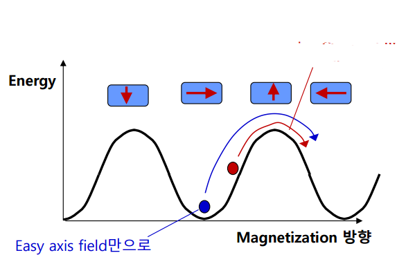 Hard axis field가 없이 Easy axis field힘만 있다면 낮은 에너지> 낮은에너지 이므로 에너지 베리어가 높으니 더 강한 자기장이 필요하다. 마름모 형태 그래프에서 x축 한방향으로 이동하려면 non switching 영역을 벗어나기에 더 큰 힘이 필요한 느낌이다.