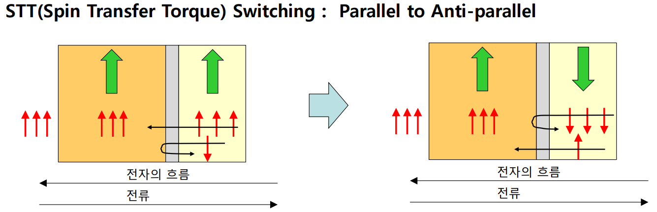 - 전자들이 자유층에서 고정층으로 갈 때, 고정층 Magnetization과 다른 spin 방향을 가진 소수의 전자