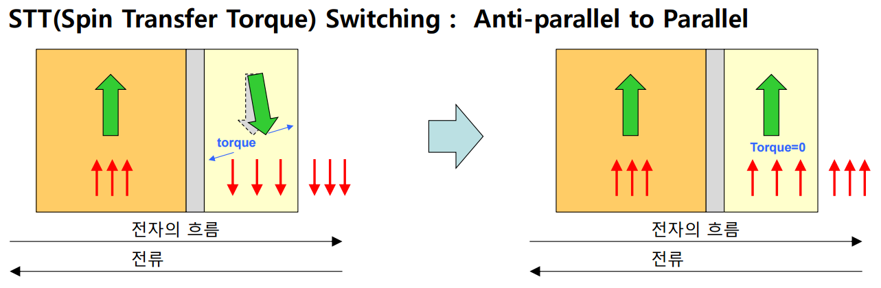 - 전자들이 자유층 Magnetization 방향에 정렬되는 만큼 반작용으로 자유층에 torque 작용