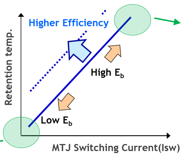Data retention이 되려면 Energy Barrier가 큰것이 좋은데, Energy Barrier가 크다면 wirte할때 필요 전류가 증가하여 trade off 관계이다.