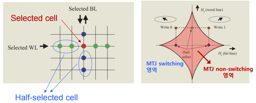 MRAM은 셀이 인접해있는데, 자기장으로 콘트롤 하기에 주변 셀들도 영향을 받는다. 그래서 x축, y축 두 도선의 자기장을 합쳤을때 유효한 힘이 되어야 write(switching)이 될 수 있도록 한다.