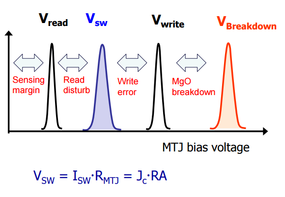 | Read 전류는 sensing을 위해 충분히 커야하는데, 또 너무 크면 read disturb가 발생할 수 있다.(switching이 되어버림) | write전류는 충분히 커야하는데 전류가 커지면 cell transistor도 커야 하기에 chip size 증가, 전력소모 증가의 단점 MTJ write time이 감소하면 write 불량 가능성 증가. 충분한 write time 필요 | 정해진 온도, 시간동안 데이터가 지워지지 않으려면 MTJ Switching을 막기 위한 Energy Barrier는 충분히 높아야 한다 (Data Retention ) 하지만 Energy Barrier가 높으면, MTJ Switching을 위해 큰 전류가 필요하게 되고, 큰 전류로 Write 반복하면 절연막의 Breakdown 유발된다 (MTJ Endurance ). 따라서 MRAM의 동작 수명을 늘리려면 MTJ Switching 전류는 작아져야 한다 |