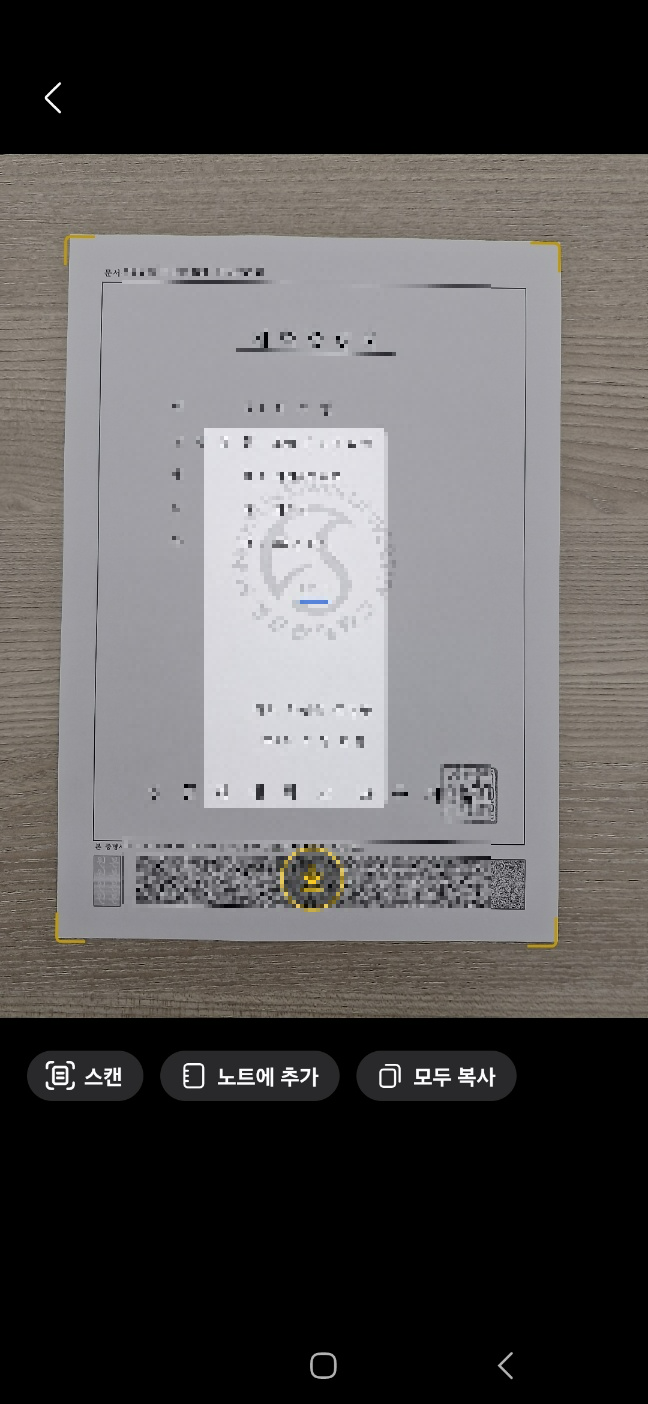 그리고 글자 인식 버튼을 누르면 스캔, 노트에 추가 등 여러 행동이 뜨는데