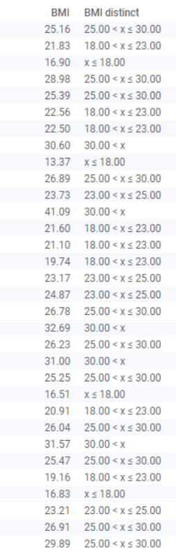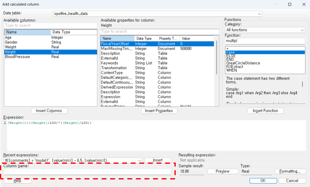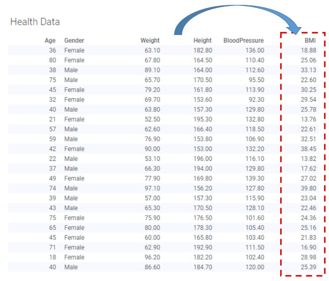 그리고 BMI 컬럼을 여기서 바로 추가 하려면 아까 컬럼 수식을 쓰면 된다.