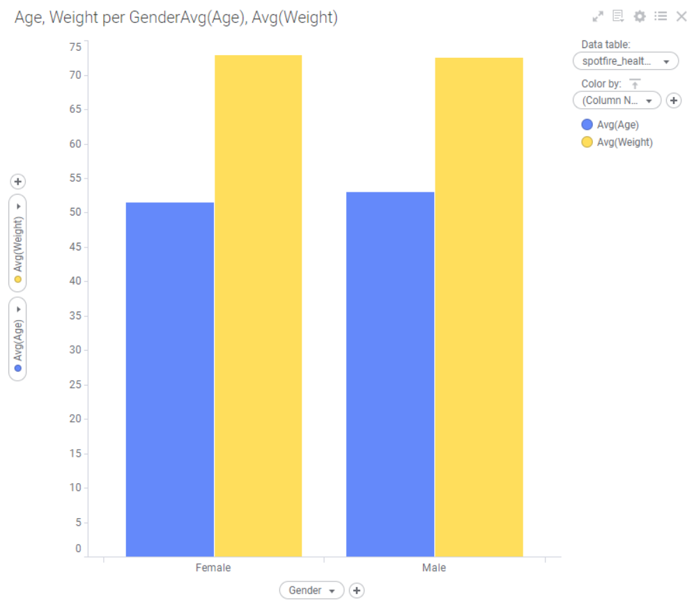 다음과 같이 gender 별로 평균 나이와 몸무게가 있다.