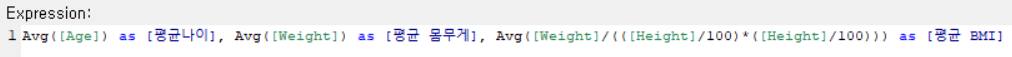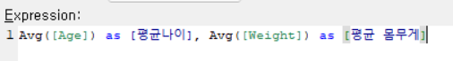 Avg([Age]) as [평균나이], Avg([Weight]) as [평균 몸무게], Avg([Weight]/(([Height]/100)*([Height]/100))) as [평균 BMI]